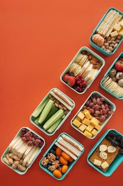 A well-structured 4-week low histamine meal plan helps maintain consistency and reduces symptom flare-ups․ Start by organizing meals into weekly themes, ensuring variety and nutrient balance․ Include fresh, histamine-friendly foods like leafy greens, fresh meats, and non-citrus fruits․ Plan breakfasts, lunches, dinners, and snacks in advance, considering prep time and ingredient availability․ Rotate protein sources, such as fresh fish, poultry, and red meats, to avoid monotony․ Incorporate naturally anti-inflammatory herbs like parsley and basil, which support histamine regulation․ Avoid leftovers older than 24 hours and opt for fresh cooking․ Adjust portion sizes based on individual needs and activity levels․ For convenience, prepare a weekly grocery list and batch-cook meals on weekends․ This structured approach ensures adherence to the diet while keeping meals enjoyable and nutritious․